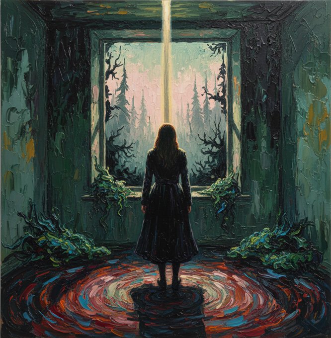 The digital engine provides the rigorous symmetry and forced perspective of the room, creating a claustrophobic yet focused composition. This algorithmic structure is then disrupted by a thick, painterly style reminiscent of palette knife application, particularly in the swirling floor and the textured, vine-choked walls. The fusion creates a tension between the calculated geometry of the window frame and the organic chaos consuming the interior.