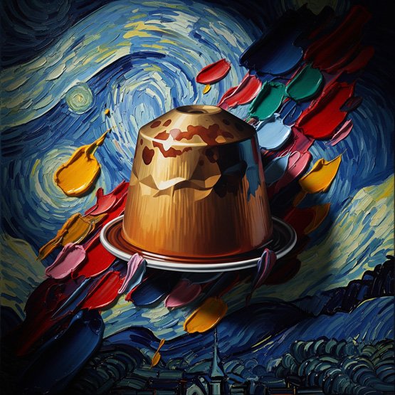 Artificial Constellation is a surreal digital artwork that reimagines a coffee capsule as a cosmic entity within a Van Gogh-inspired vortex, showcasing how AI for artists can fuse commercial iconography with classical expressionism to explore consumerist entropy.