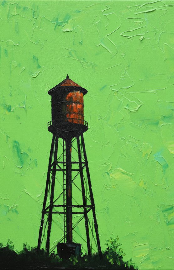The deviation lies in the atmospheric denial; the background refuses to be a sky. Instead of atmospheric depth or cloud cover, the “sky” is rendered as a flat, aggressive wall of textured electric lime impasto. This creates a vacuum where the rusty, weathered textures of the tank appear to be suspended in a synthetic gel rather than open air.