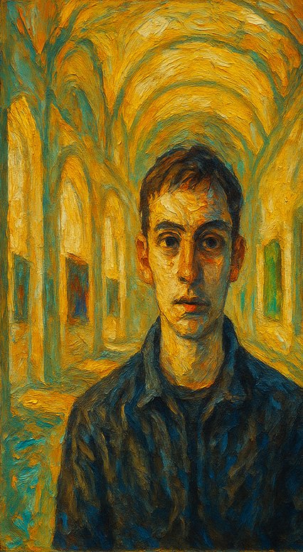 Golden Nave is a striking digital portrait that merges expressionist impasto with architectural depth, illustrating how AI for artists can visualize the internal psychological space of the modern individual.