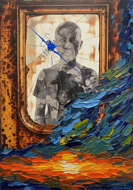 Shattered Thesis investigates the fragmentation of identity by physically and metaphorically breaking the plane of the subject’s existence. It serves as a visual manifesto, exploring the fractured, vulnerable architecture of the human condition. This work architects a confrontation between a static, historical self and a turbulent, consuming present.