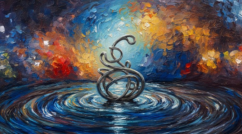 The central anomaly is the hyper-reflective, seamless “chrome rhizome” at the composition’s core. While the environment adheres to the chaotic physics of fluid dynamics and atmospheric turbulence, this metallic loop possesses a frictionless, mathematical perfection impossible in nature, a glitch of infinite continuity amidst organic decay.