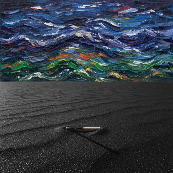 The definitive anomaly is the Horizon Line Glitch. The artwork does not attempt to blend the two realities, it enforces a violent severance. The laws of physics fracture at the horizon: the bottom half exists in a vacuum of hyper-realistic silence and stillness, while the top half operates under the frantic, swirling physics of heavy impasto oil, completely detached from the light source casting the shadow on the match.