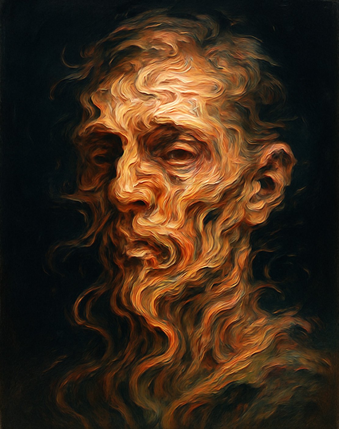 The digital substrate supplied the precise anatomical mapping of the subject’s features. This data was then subjected to an aggressive fluid dynamics simulation, visualized through the tactile aesthetic of thick, oil-based impasto brushwork, causing the digital structure to appear physically melted and gravitationally heavy.