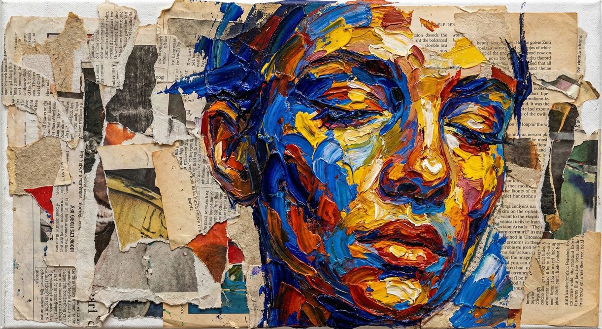 Yesterday’s Echo architects a visceral investigation into the layering of memory and identity. By merging a vibrant, impasto portrait with a substrate of decaying historical newspapers, it focus on the psychology of the gaze and the passage of time. This work embed narrative directly into the physical texture of a composition.